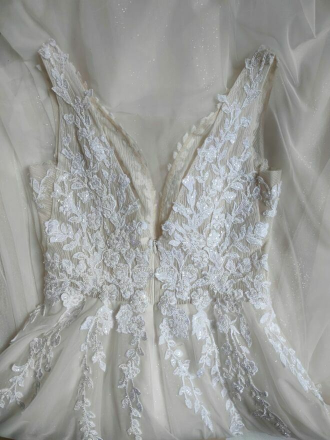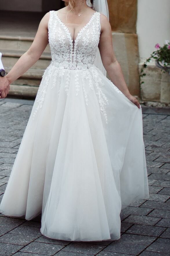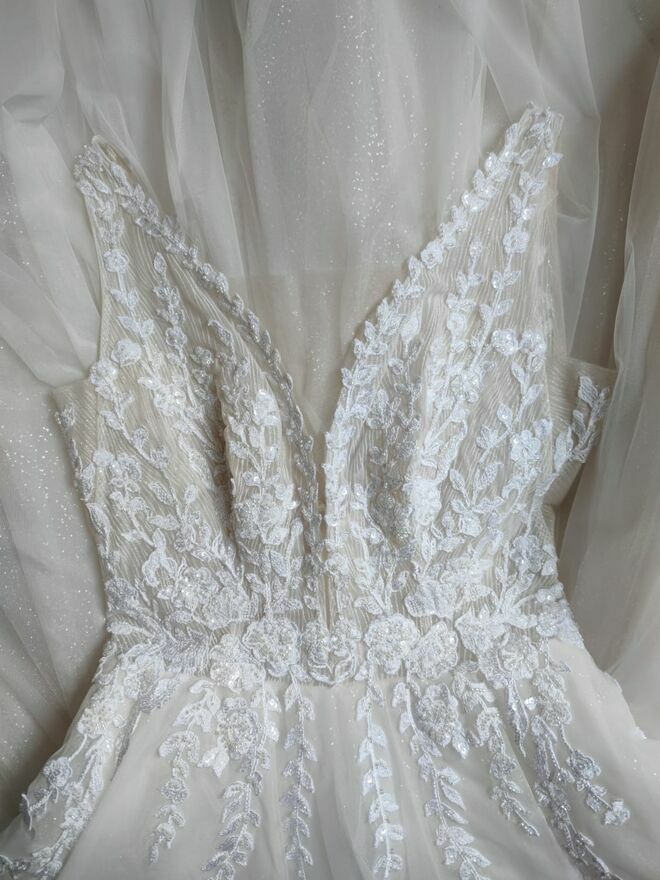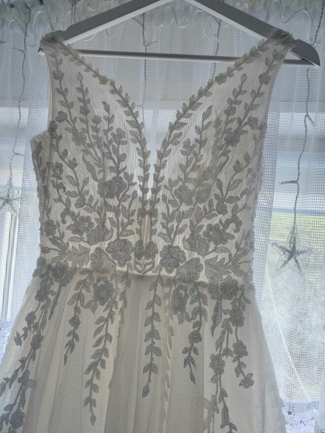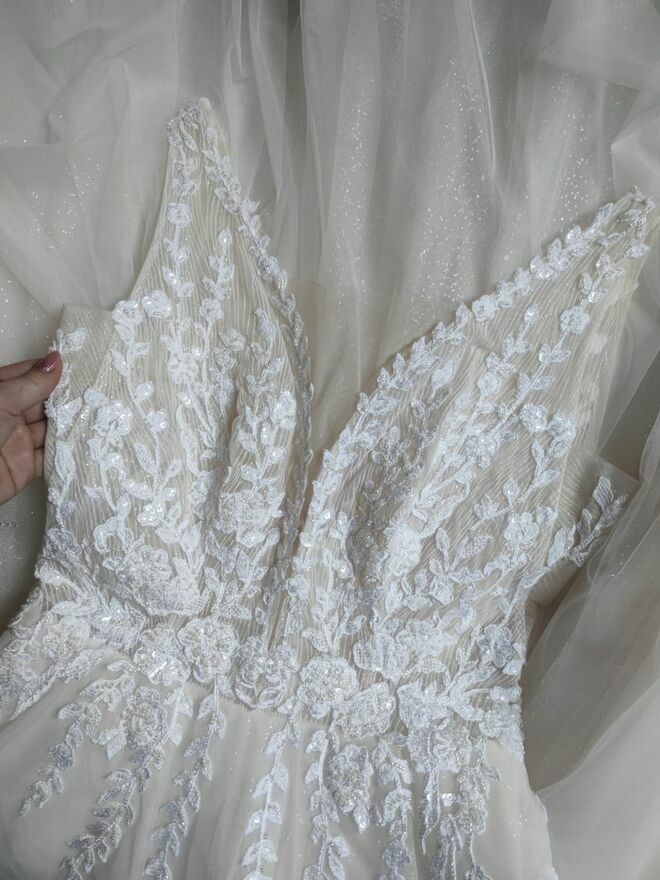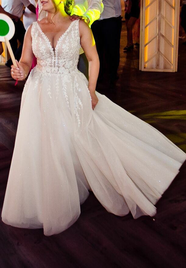 Witam , Na sprzedaż Przepiękna suknia ślubna na ramiączkach , z mieniącym się tiulem oraz koronkową góra.Suknia pochodzi z kolekcji ślubnej 2023/2024
